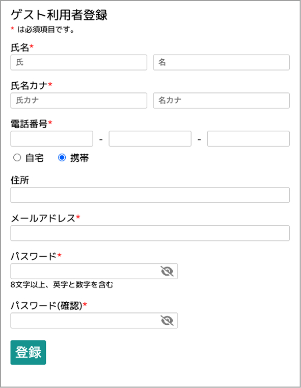 ゲスト利用者登録画面にて必要事項を入力し「登録」ボタンを押下。