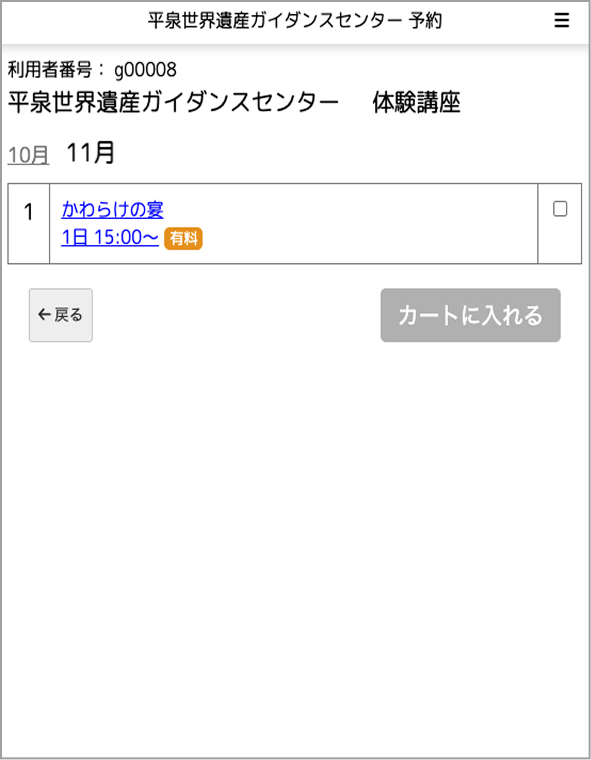 希望する体験講座を選択し、「カートに入れる」